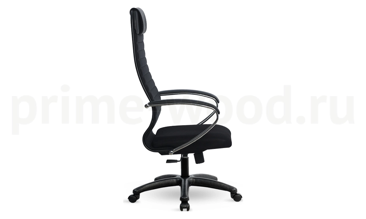 Спинка: высокая с мягким подголовником, черное полимерное покрытие каркаса, ширина 475 мм